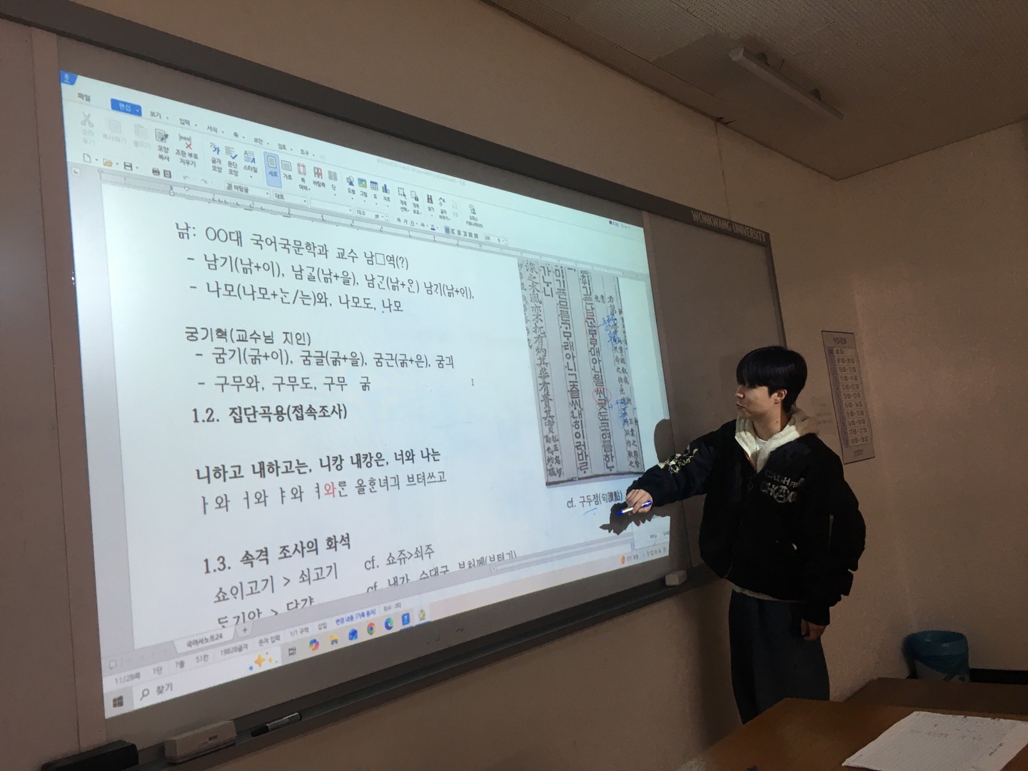 국어국문학과 3학년에 재학 중인 김동희 학생은 국어국문학과 학생들을 대상으로 구두점의 유래와 의미에 대해 흥미로운 설명을 진행하였습니다. 마침표, 쉼표, 물음표 등 익숙한 기호들이 어떻게 만들어지고 사용되어 왔는지 역사적 배경과 함께 소개하며 학생들의 큰 관심을 이끌었습니다. 또한 문장 속에서 구두점이 수행하는 기능과 현대 국어 표현에서의 중요성까지 자세히 짚어주어 실질적인 도움이 되었습니다. 이번 설명을 통해 학생들은 글쓰기의 기본 요소를 더욱 깊이 이해하는 뜻깊은 시간을 보냈습니다. 열심히 하는 학생의 모습이 참 기특하네요^^